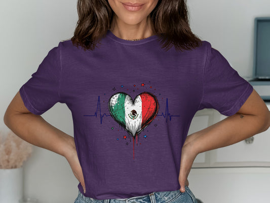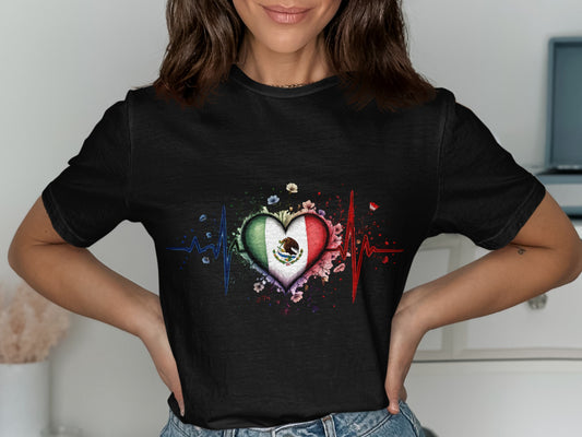 Mexican Flag Heartbeat Graphic Floral Design T-Shirts
