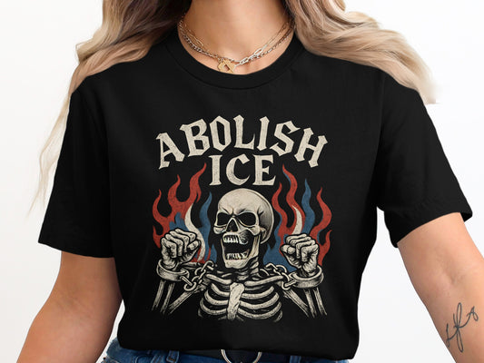 Abolish ICE Skeleton Flaming Chains Graphic T-Shirts