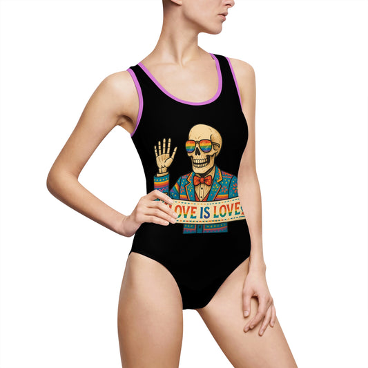 LGBTQ+ Pride Swimwear, Colorful Skeleton Love is Love Swimsuit, Trendy Beachwear, Summer Pool Party, Unique Gift for Her
