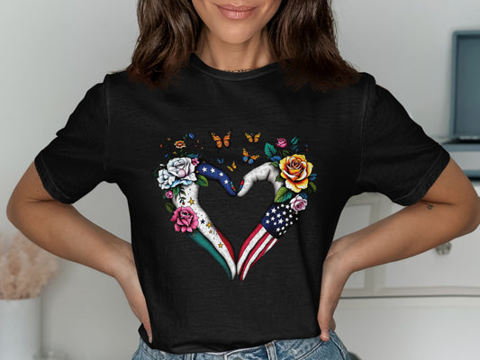 Patriotic USA Heart Hand Design Floral Butterflies T-Shirts