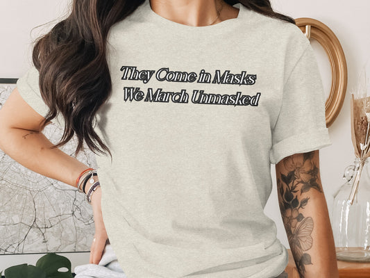 They Come in Masks We March Unmasked Statement T-Shirts