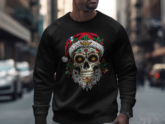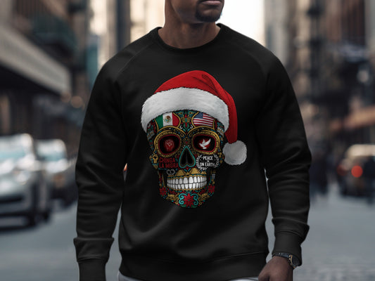 Sugar Skull Wearing Santa Hat and Mexico Flags Sweatshirts