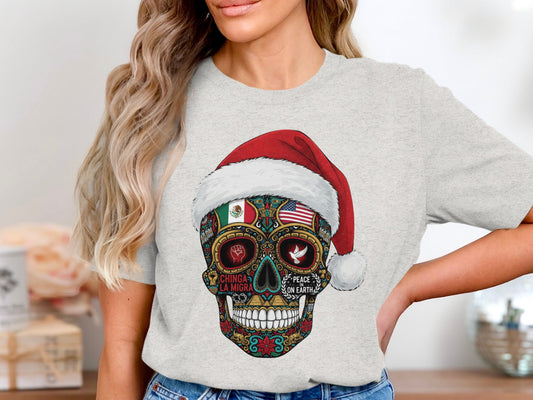 Sugar Skull T-Shirts - Christmas Skull Design With Mexico USA Flags & Santa Hat Gift