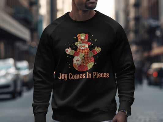 Joy Comes In Pieces Holiday Themed Quilted Snowman Sweatshirts