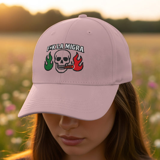 Skull with Flames And Fuck La Migra Design Hat Embroidery
