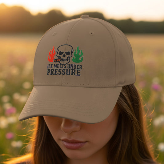 Ice Melts Under Pressure Skull and Flames design hat embroidery