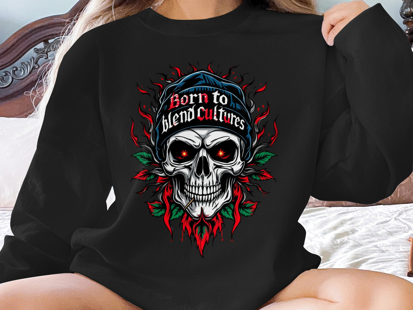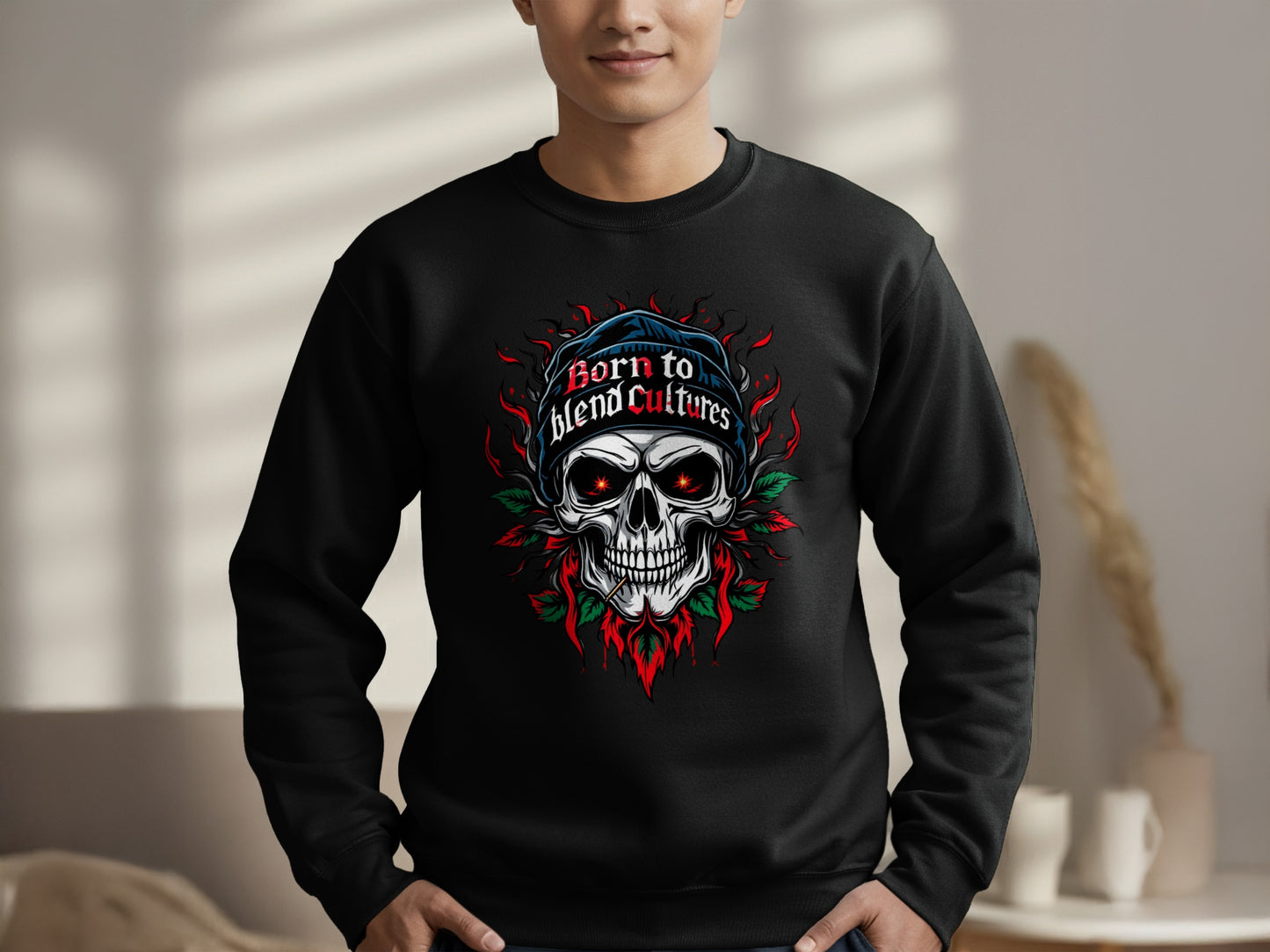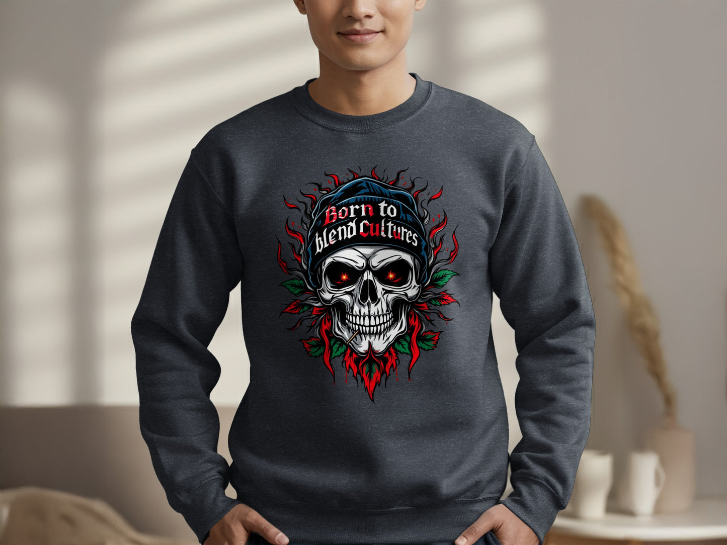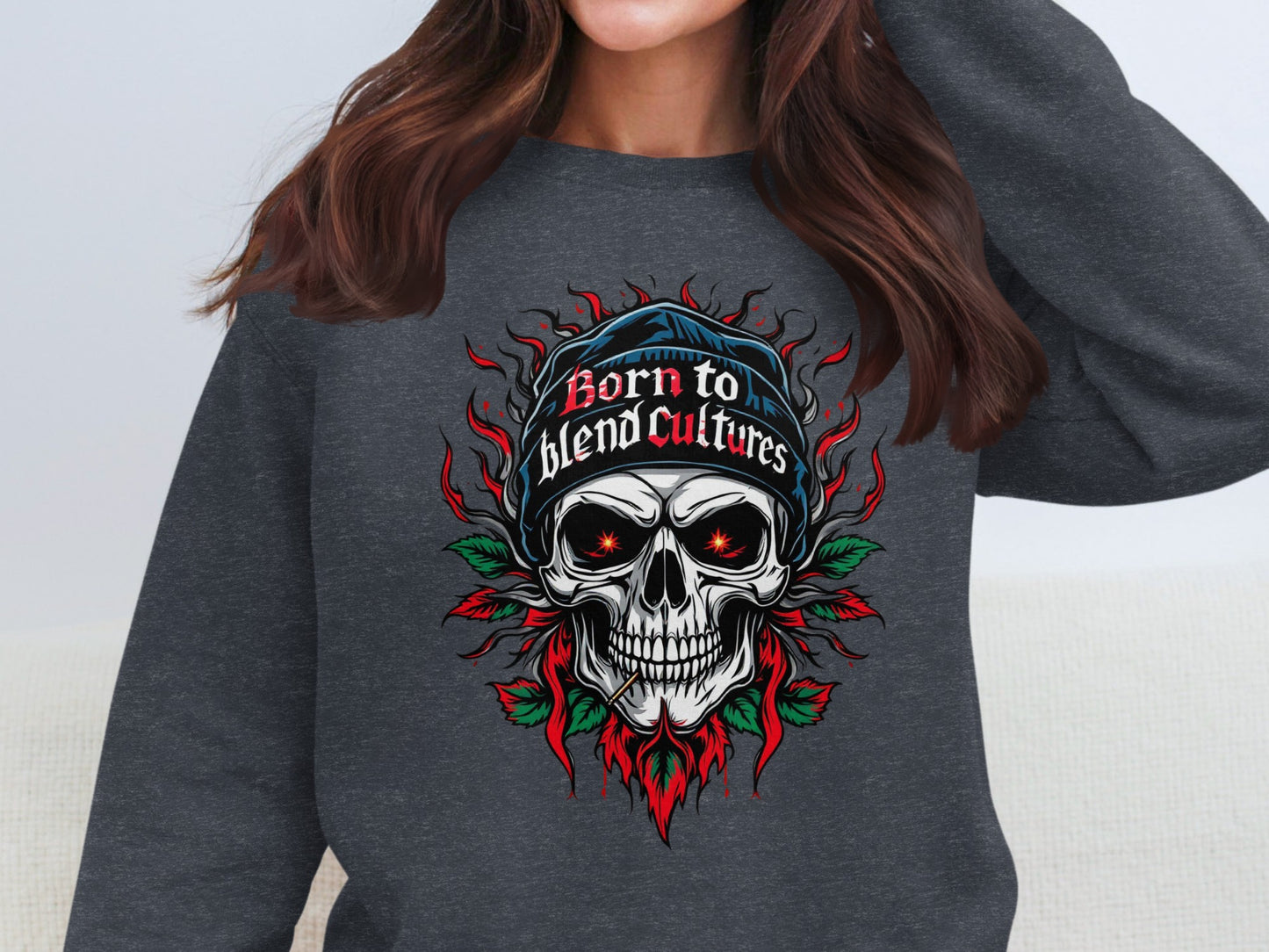 Stand out with our "Born to Blend Cultures" skull graphic sweatshirts featuring a bold design that is sure to turn heads and make a statement.