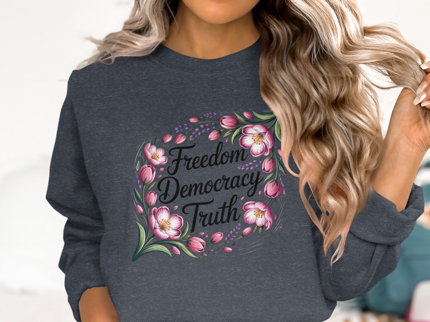 Show your love for freedom democracy and truth with our vibrant floral print sweatshirts. Perfect for adding a touch of positivity and style to your wardrobe.
