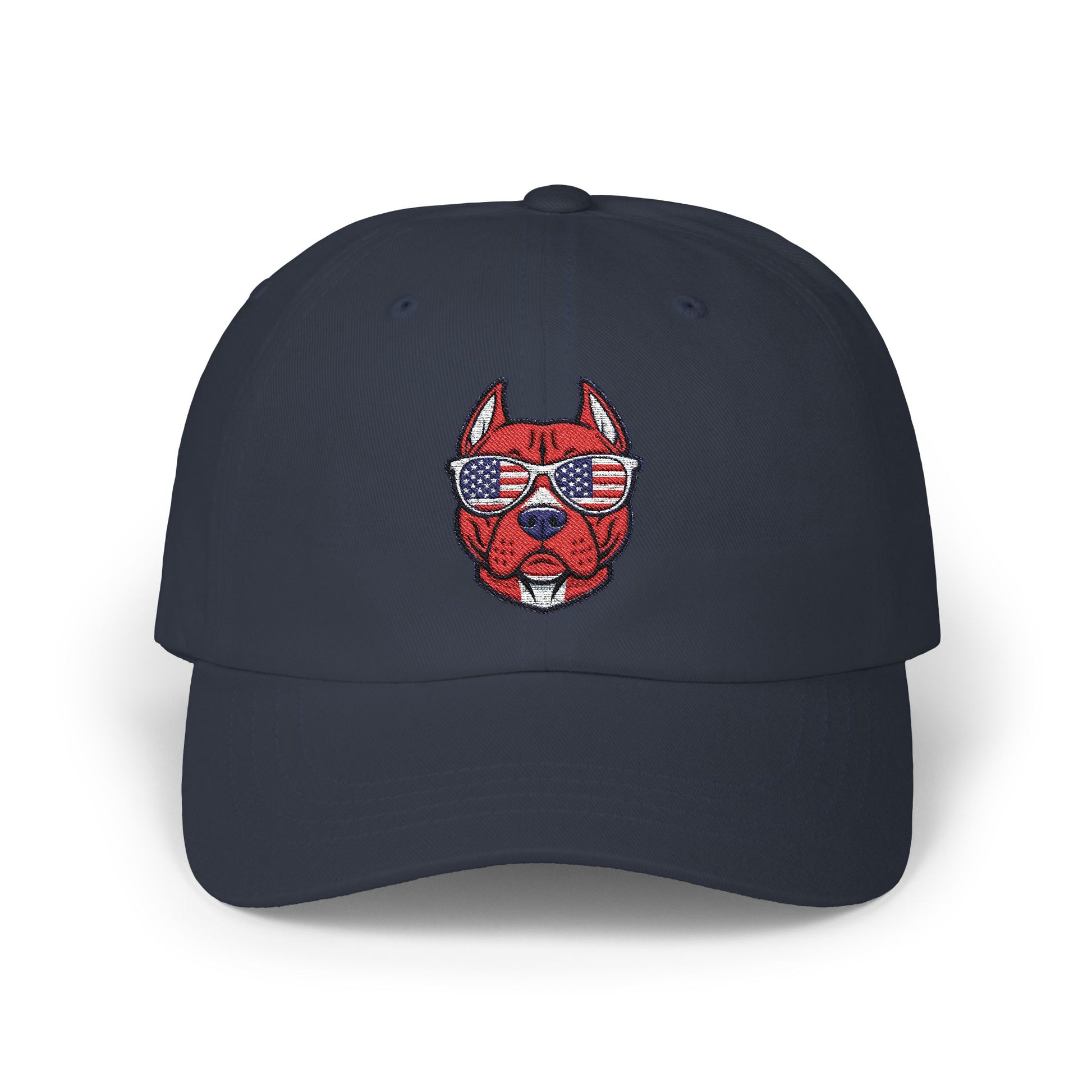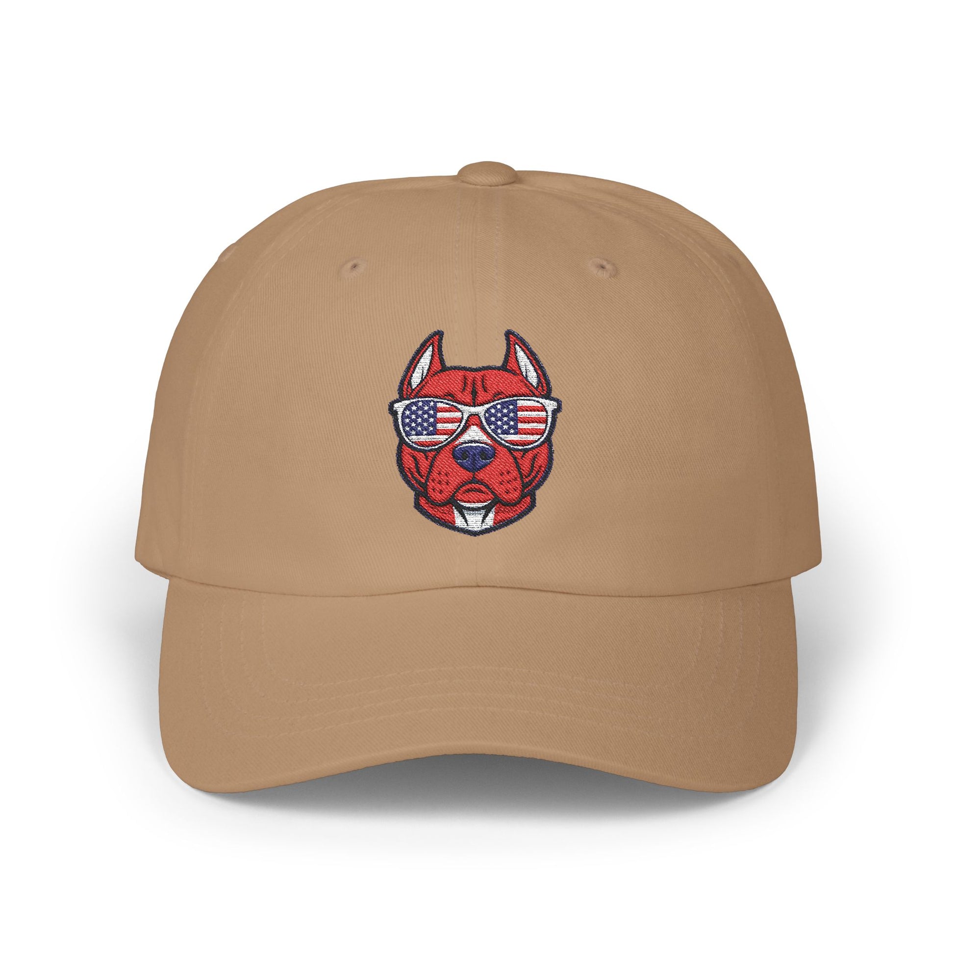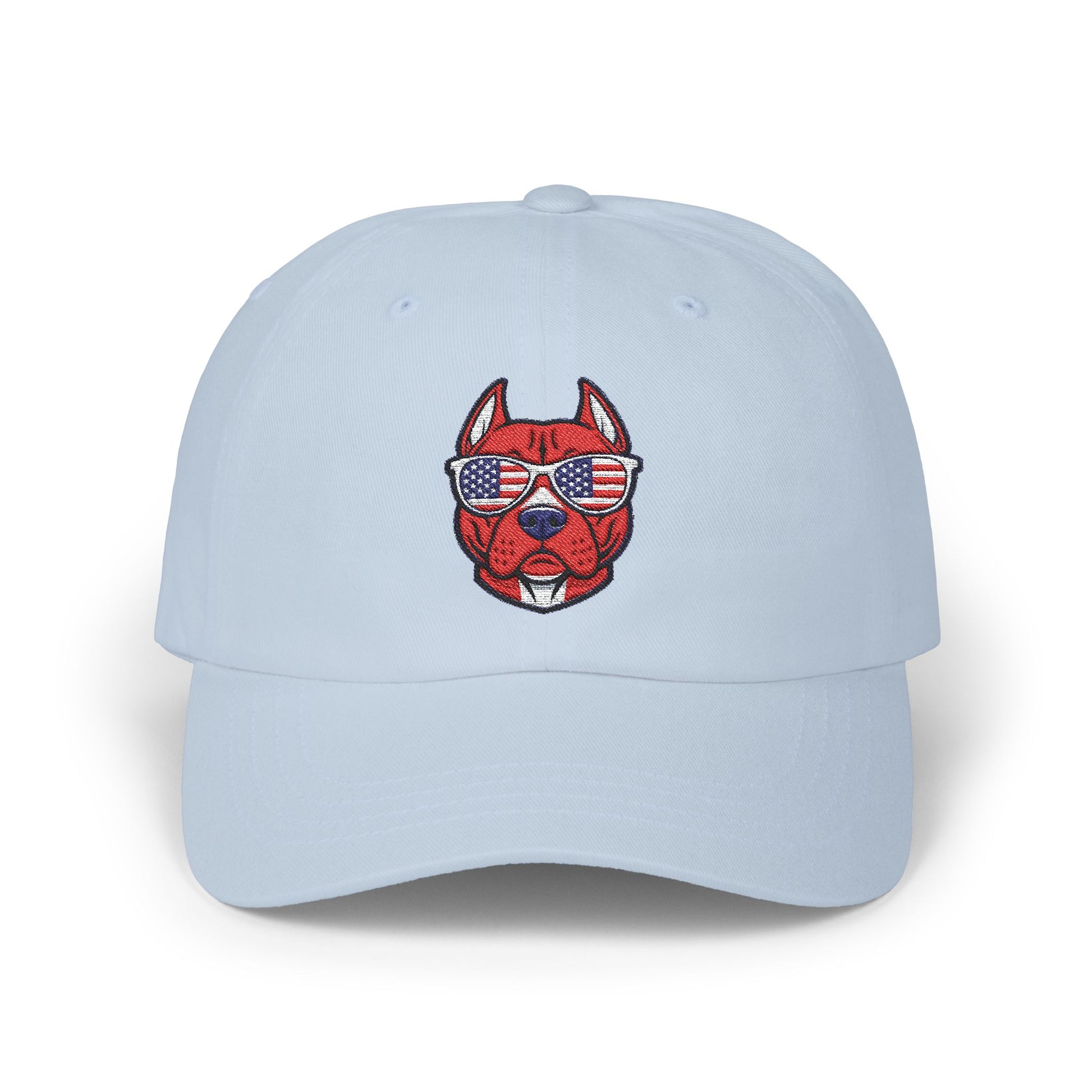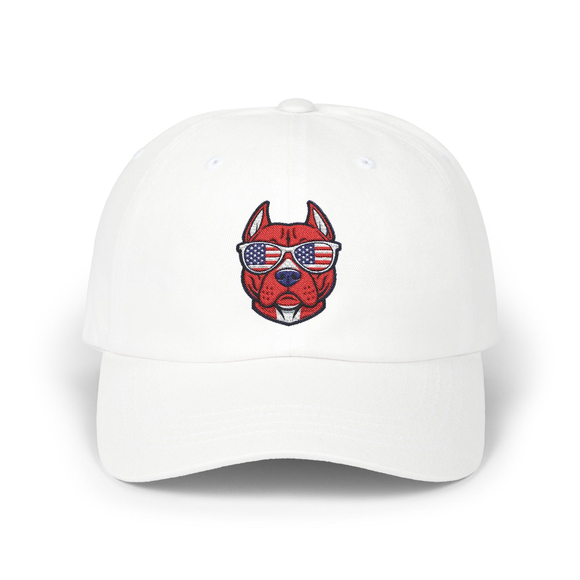 Patriotic Dog Dad Cap - Classic White Hat with American Flag Sunglasses Design
