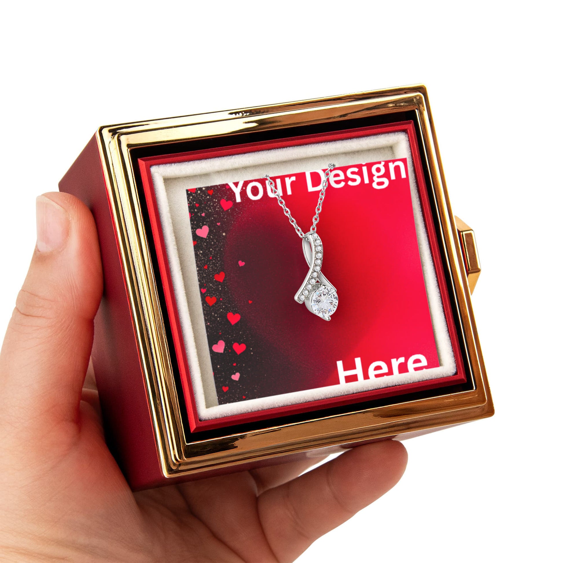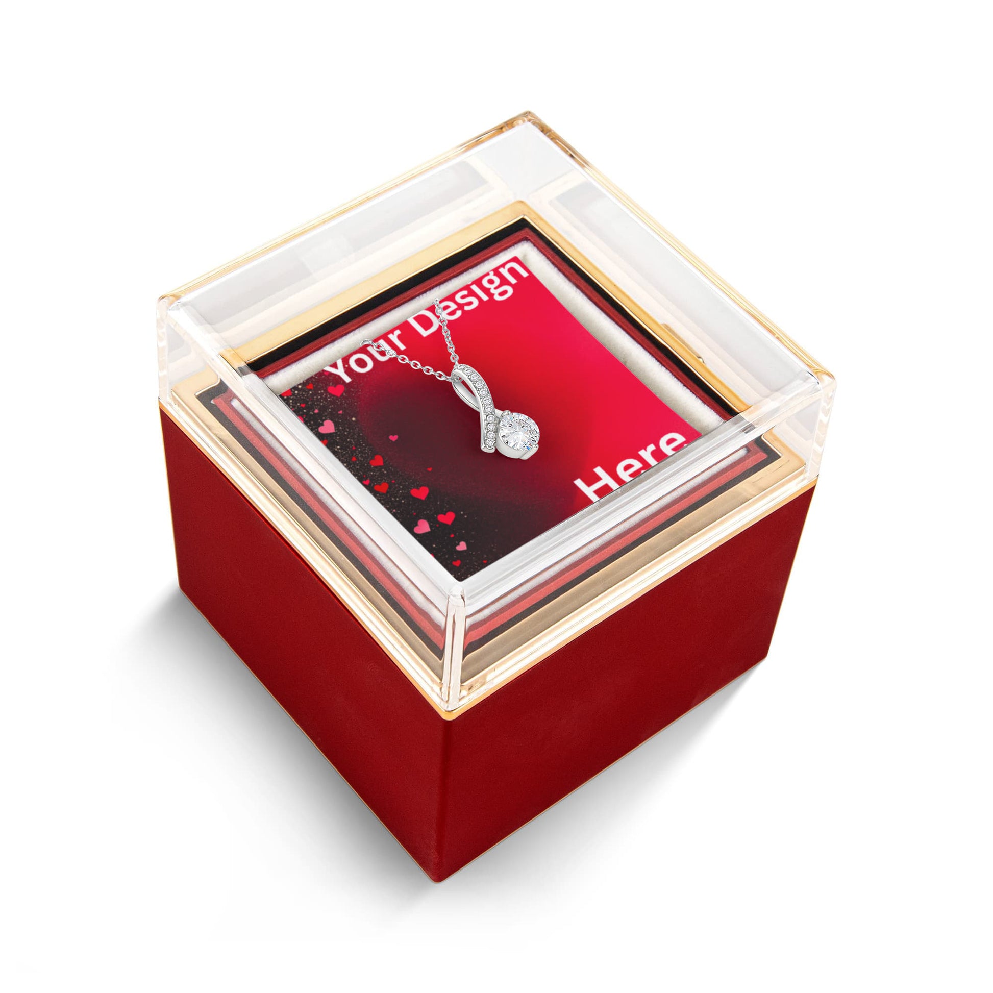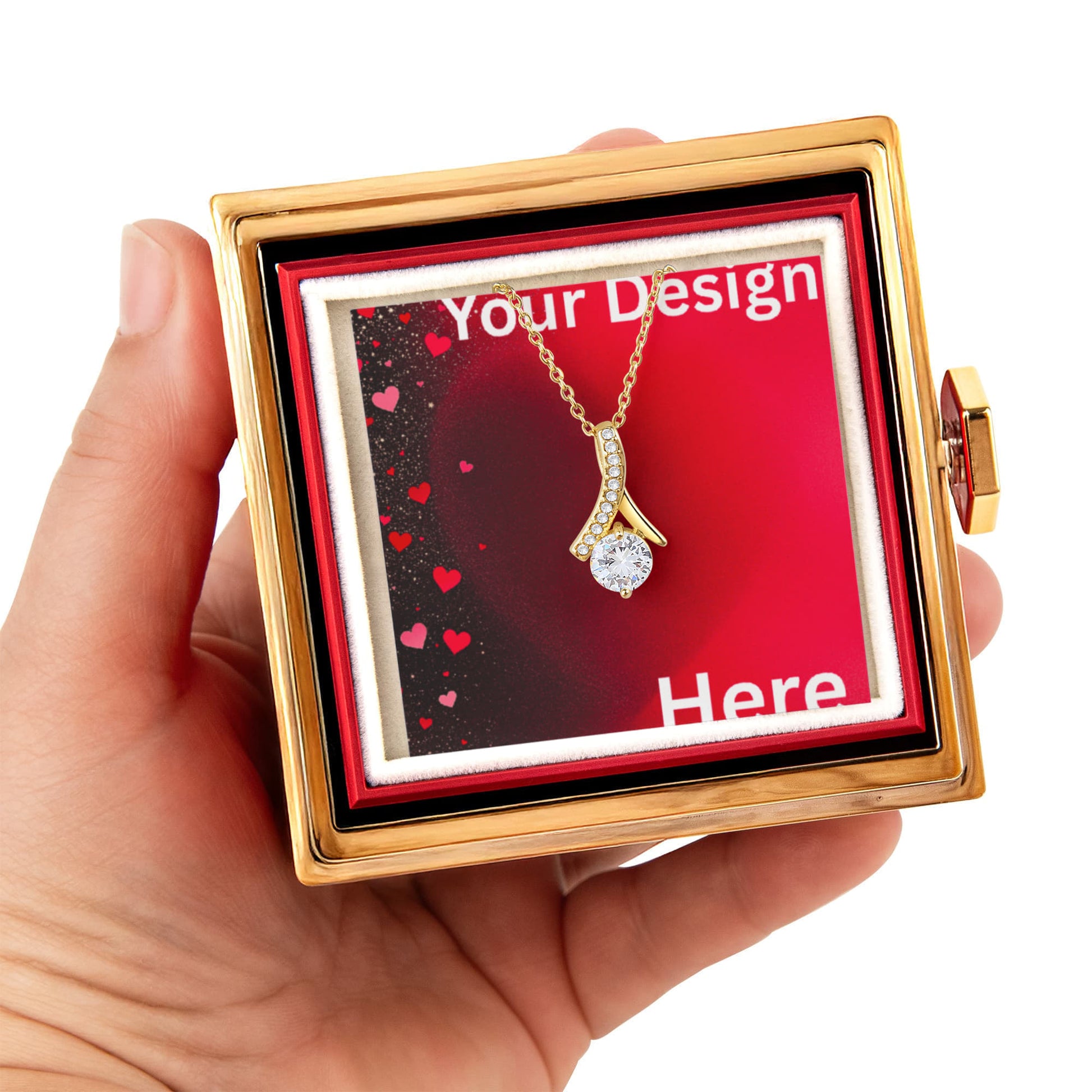 Imagine her reaction as she receives this beautiful Alluring Beauty Necklace. The luxurious box, featuring a charming preserved rose that never fades, adds an extra touch of love. With a simple turn of the gold knob, her breathtaking gift is revealed—making it the perfect sentimental gift for that special someone.
