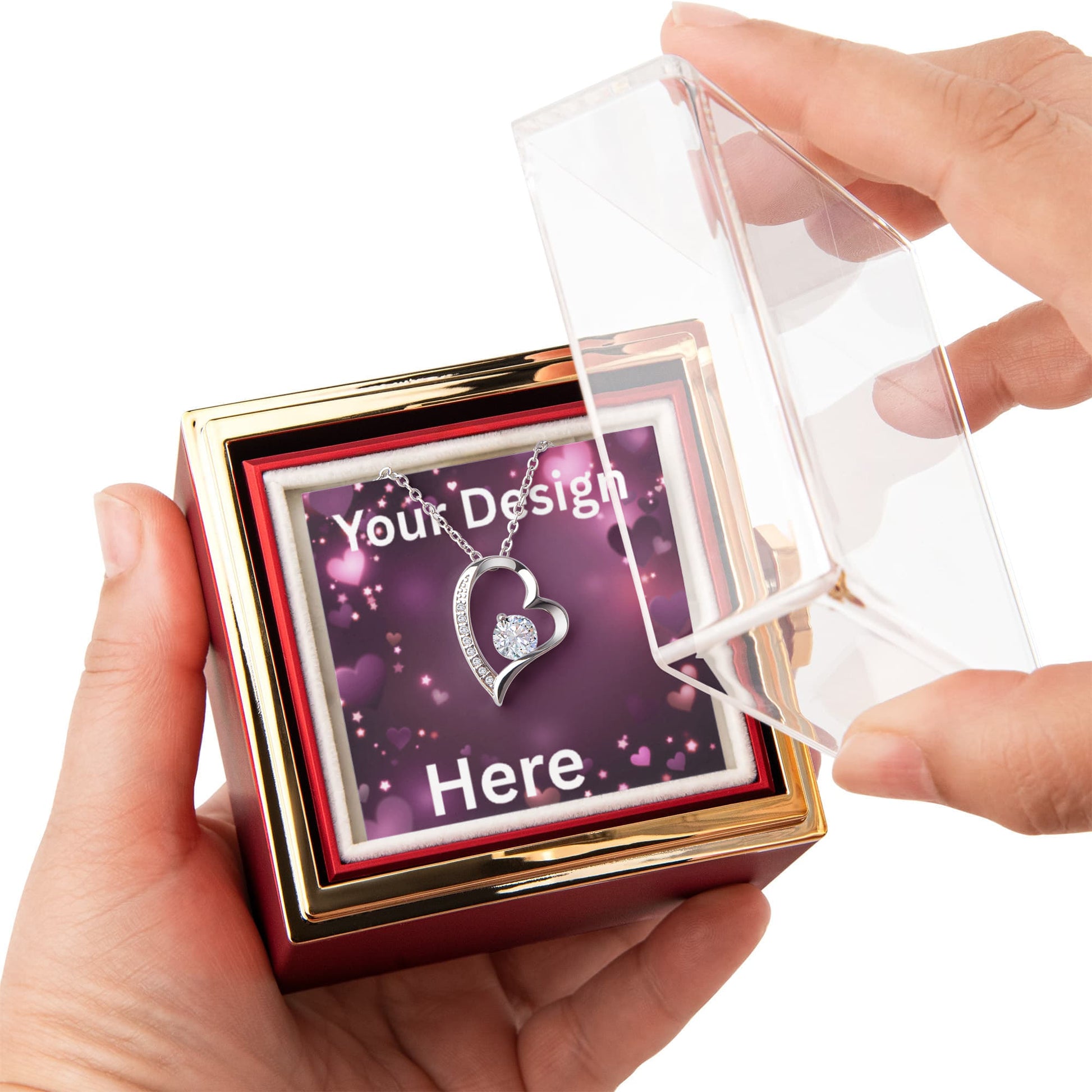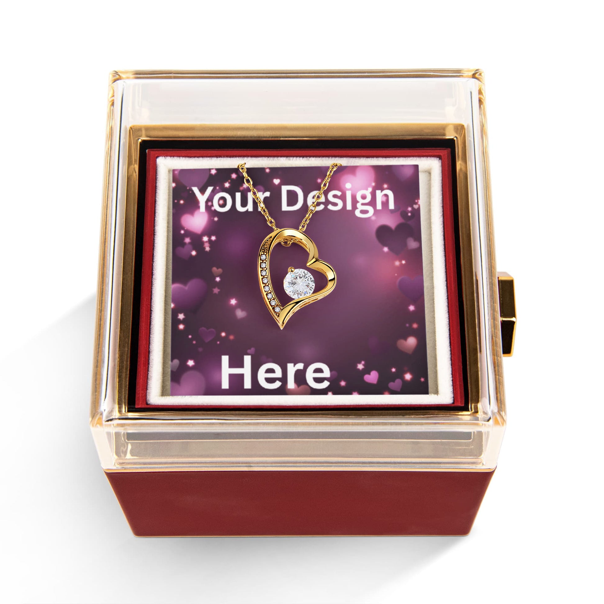 Imagine her reaction as she receives this beautiful Forever Love Necklace. The luxurious box, featuring a charming preserved rose that never fades, adds an extra touch of love. With a simple turn of the gold knob, her breathtaking gift is revealed—making it the perfect sentimental gift for that special someone.