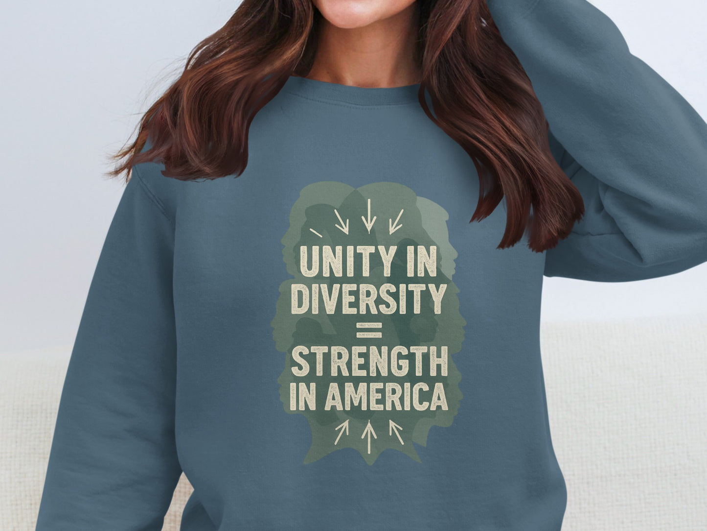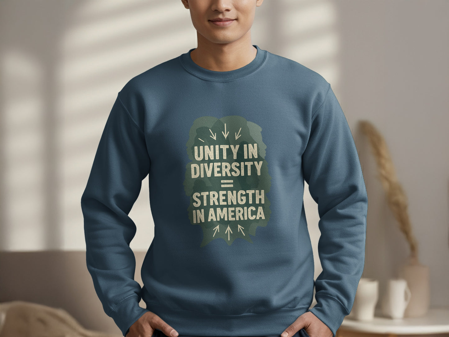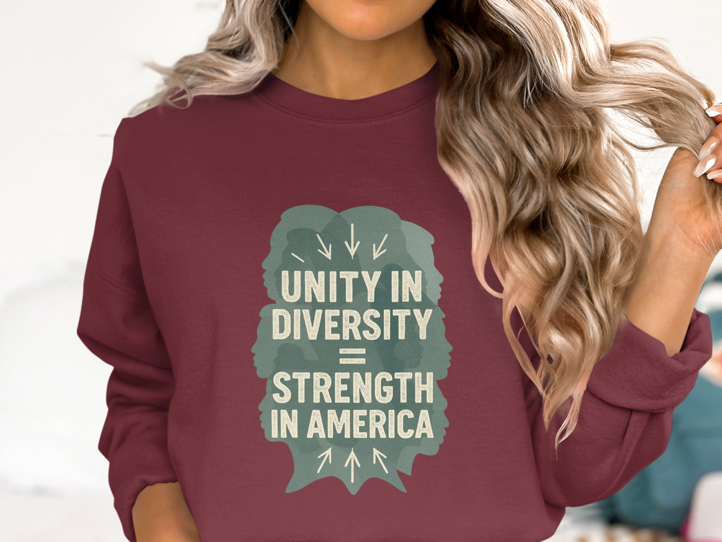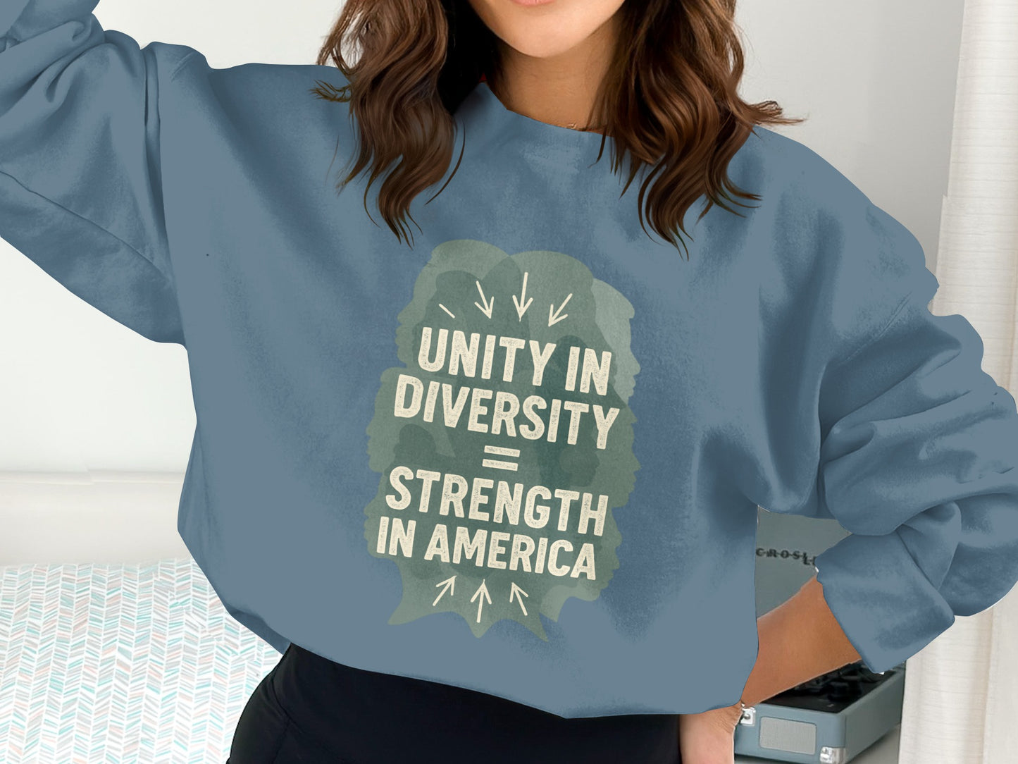 Show off your pride with our unity-themed sweatshirts featuring the powerful message "Unity In Diversity Equals Strength In America".